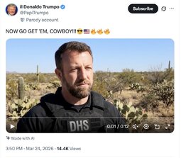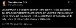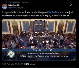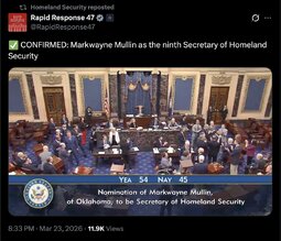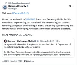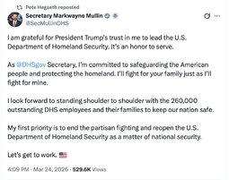 >>32087 SecMarkwayneMullin (TwiX) I am grateful for President Trump’s trust in me to lead the U.S. Department of Homeland Security. It’s an honor to serve.