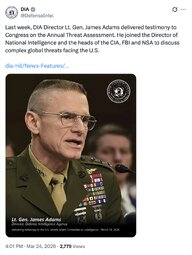 >>32071 DIA (TwiX) Last week, DIA Director Lt. Gen. James Adams delivered testimony to Congress on the Annual Threat Assessment. He joined the Director of National Intelligence and the heads of the CIA, FBI and NSA to discuss complex global threats facing the U.S.