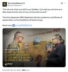 >>32063 USArmyReserve (TwiX) “It’s not only what you did for our Soldiers, but what you do here on a daily basis to take care of our communities as well.”