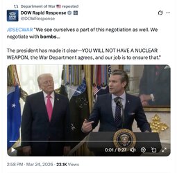 >>32030 DoWRR (TwiX) .@SECWAR "We see ourselves a part of this negotiation as well. We negotiate with bombs…