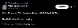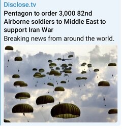 >>32088 D.tv (T.me) JUST IN - Pentagon to order, within the next hours, 3,000 troops of the Army's elite 82nd Airborne Division to deploy to the Middle East to "support" the Iran War.