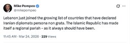 >>32023 Kansas (TwiX) Lebanon just joined the growing list of countries that have declared Iranian diplomats persona non grata. The Islamic Republic has made itself a regional pariah - as it always should have been.