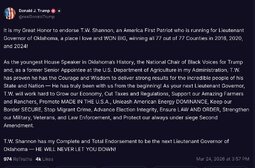 >>32057 DJT (TruSoc) It is my Great Honor to endorse T.W. Shannon, an America First Patriot who is running for Lieutenant Governor of Oklahoma, a place I love and WON BIG, winning all 77 out of 77 Counties in 2016, 2020, and 2024!