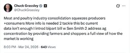 >>32089 ChuckGrassley (TwiX) Meat and poultry industry consolidation squeezes producers +consumers More info is needed 2 tackle this bc current data isn’t enough I introd bipart bill w Sen Smith 2 address ag concentration by providing farmers and shoppers a full view of how the market is working