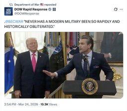 >>32029 DoWRR (TwiX) .@SECWAR "NEVER HAS A MODERN MILITARY BEEN SO RAPIDLY AND HISTORICALLY OBLITERATED."