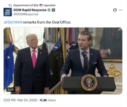 >>32031 DoWRR (TwiX) .@SECWAR remarks from the Oval Office.
