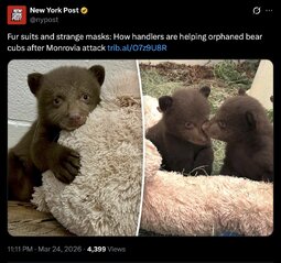 >>32090 NYPost (TwiX) Fur suits and strange masks: How handlers are helping orphaned bear cubs after Monrovia attack