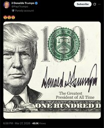>>33311 D.tv (T.me) JUST IN - Trump's signature will be added to U.S. dollar banknotes to commemorate the 250th anniversary of U.S. independence. Trump's signature will replace that of the U.S. treasurer, which has appeared on U.S. dollar bills since 1861.