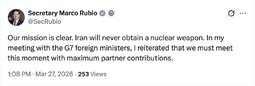 >>33345 SecMarcoRubio (TwiX) Our mission is clear. Iran will never obtain a nuclear weapon. In my meeting with the G7 foreign ministers, I reiterated that we must meet this moment with maximum partner contributions.