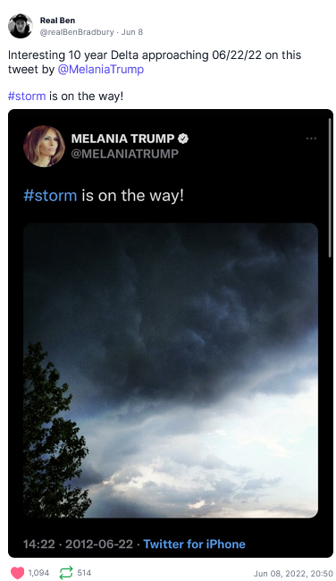 >>139955 Interesting 10 year Delta approaching 06/22/22 on this tweet by @MelaniaTrump