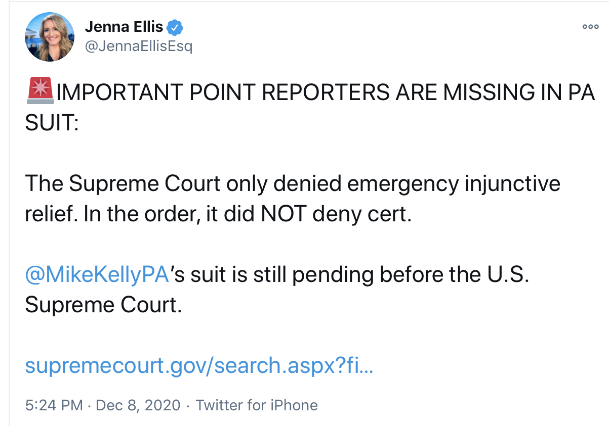 >>11955968 U.S. Supreme Court gives the states of GA MI PA WI until 3:00pm Thursday to respond to the filing by Texas