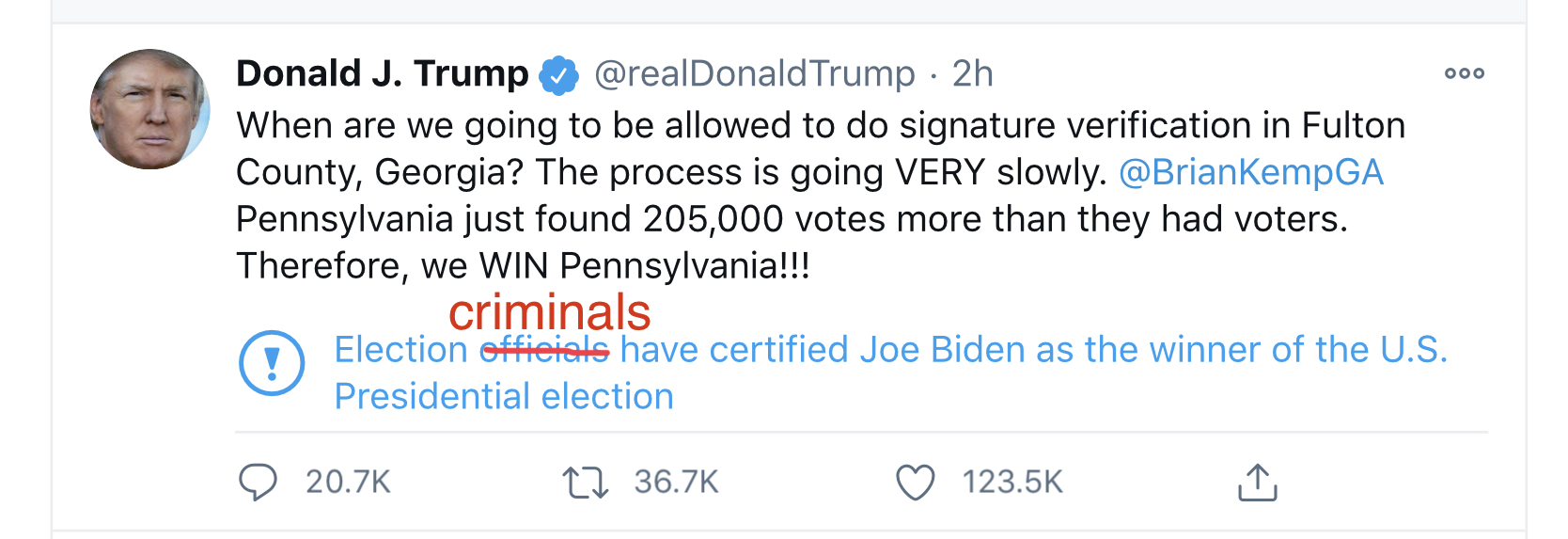 >>12241589 POTUS: We now have far more votes than needed to flip Georgia in the Presidential race. Massive VOTER FRAUD took place. Thank you to the Georgia Legislature for today’s revealing meeting!