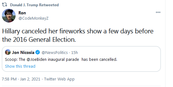 >>12295382 @NewsPolitics - "Ps. Any legit news source who'd like it. My scoop is based on emails sent to National Capitol Region military from the Presidential Inauguration Committee telling them the Parade was cancelled and their participation would not be required. DM me."