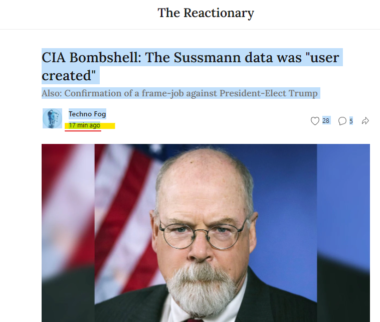 >>16086094, >>16086147 Techno_Fog: Special Counsel Durham files CIA notes from Michael Sussmann's February 2017 meeting with the CIA