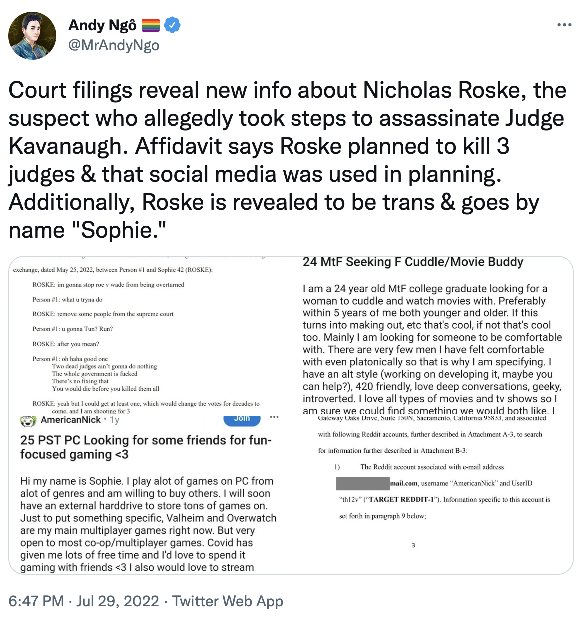 >>16934880 The reddit accounts of Nicholas Roske (Justice Kavanaugh's would-be assassin) have been revealed. - twat