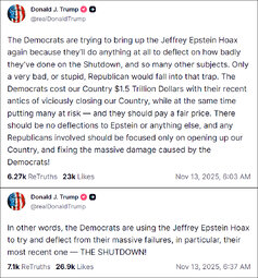 >>23847758 Video: New Epstein emails allege Donald Trump 'knew about the girls - Newly released emails from Jeffrey Epstein to Ghislaine Maxwell and author Michael Wolff have intensified scrutiny of Donald Trump’s past association with the disgraced financier, though the documents do not allege wrongdoing by the US President. Democrats released more than 20,000 estate documents, including a 2011 claim that Virginia Giuffre “spent hours” at Epstein’s home with Trump and a 2019 message asserting Trump “knew about the girls”. The White House condemned the release as a partisan hit, insisting Trump expelled Epstein from Mar-a-Lago and “did nothing wrong”. The timing coincides with a bipartisan House push to force the public release of all Epstein files after a petition reached 218 signatures.