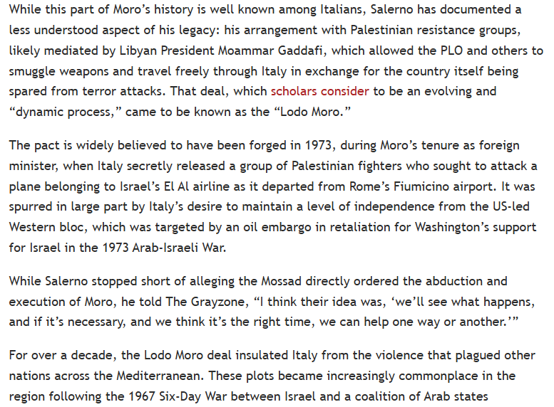 The reporter told The Grayzone that Moro, who was arguably Italy’s most important leader, became a thorn in the side of powerful forces who sought to keep his country firmly lodged in the pro-Western bloc. Salerno believes Italy’s long-term foreign policy would have developed differently if Moro had survived, adding, “that’s what they were afraid of in the United States.”