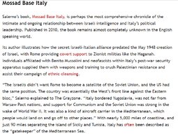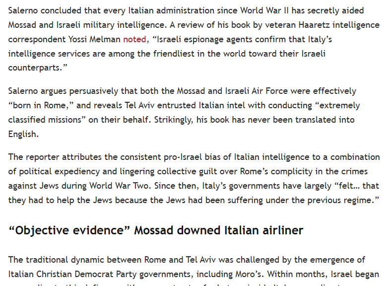 Having worked closely alongside multiple Italian heads of state during his 30-year career as a correspondent, Salerno published an expose of their secret relationship with Israeli intelligence in 2010 called Mossad Base Italy.