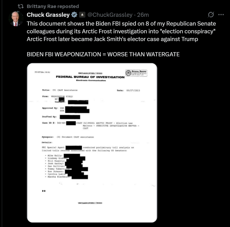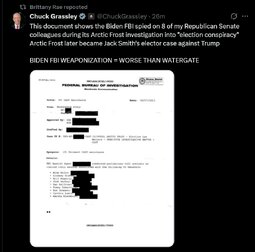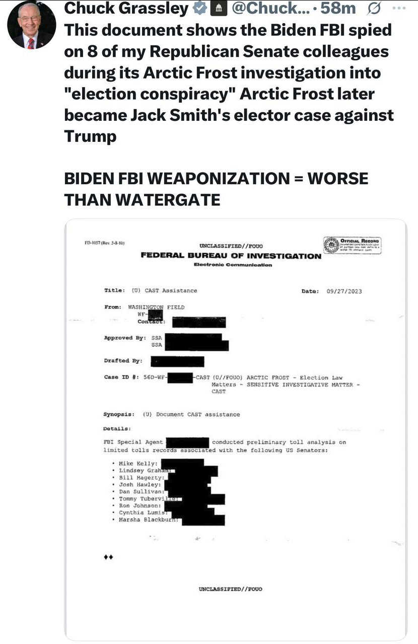 >>23701874 @ChuckGrassley Biden FBI spied on 8 of my [R] Senate colleagues during Arctic Frost
