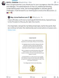 Dear Congresswoman Luna, thank you for your courageous stand for peace and dialogue. The world depends on the U.S. and Russia listening, understanding each other, and working together to address global challenges. I look forward to our meeting and constructive discussion.🕊️🇷🇺🤝🇺🇸