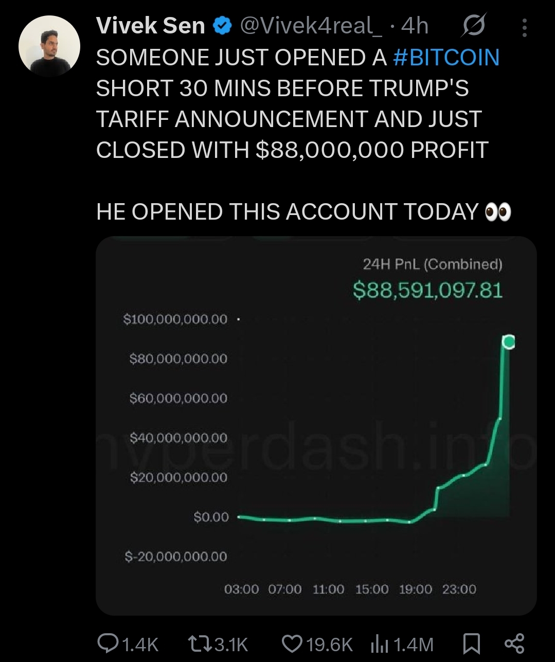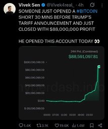 >>23722552, >>23722566 SOMEONE JUST OPENED A #BITCOIN SHORT 30 MINS BEFORE TRUMP'S TARIFF ANNOUNCEMENT, CLOSED WITH $88,000,000 PROFIT