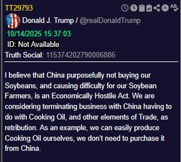 >>23738018 @realDonaldTrump China purposefully not buying our Soybeans, and causing difficulty for our Soybean Farmers, is an Economically Hostile Act.