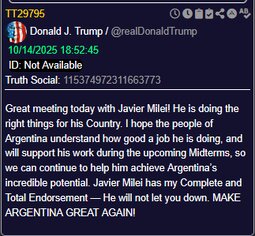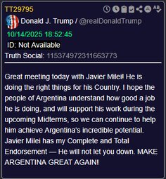 >>23737641 @POTUS: "It's a great honor to have the leader of Argentina… he's MAGA all the way, it's 'Make Argentina Great Again'