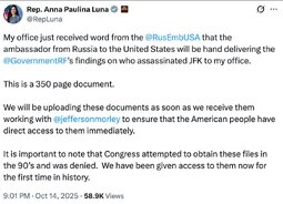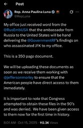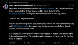 The Russian ambassador to the US has given Republican Congresswoman Anna Paulina Luna the declassified Soviet files on the assassination of John F. Kennedy, the embassy announced on Tuesday.