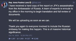 >>23738195, >>23738221, >>23738245 🇷🇺🇺🇸 Russia to declassify and deliver 350 page document "on who assassinated JFK" to US Rep Luna.