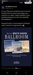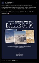 >>23751021, >>23751166 For over 100 years, presidents have enhanced the White House, preserving its legacy as a symbol of our nation. Today, President Trump proudly broke ground on the new, big White House Ballroom. Privately funded, it costs taxpayers nothing & will be cherished for generations. 🇺🇸