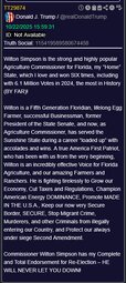 Wilton Simpson is the strong and highly popular Agriculture Commissioner for Florida, my “Home” State, which I love and won SIX times, including with 6.1 Million Votes in 2024, the most in History (BY FAR)!