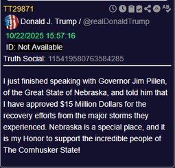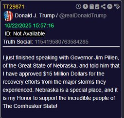 >>23757297 @realDonaldTrump I have approved $15 Million Dollars for the recovery efforts from the major storms Nebraska experienced.