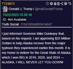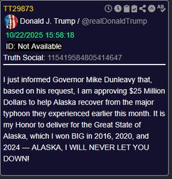 I just informed Governor Mike Dunleavy that, based on his request, I am approving $25 Million Dollars to help Alaska recover from the major typhoon they experienced earlier this month. It is my Honor to deliver for the Great State of Alaska, which I won BIG in 2016, 2020, and 2024 — ALASKA, I WILL NEVER LET YOU DOWN!
