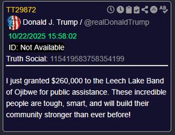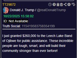 >>23757303 @realDonaldTrump I just granted $260,000 to the Leech Lake Band of Ojibwe for public assistance.