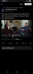 >>23755889 @PressSec: As @POTUS very clearly stated in the Oval Office today, he will gladly meet with Democrats to talk about healthcare or whatever other issue they want to talk about… but he's not going to have those conversations until Democrats simply vote to reopen the government.