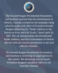 >>23763049, >>23763053 @realDonaldTrump The Ronald Reagan Foundation has just announced that Canada has fraudulently used an advertisement, which is FAKE, featuring Ronald Reagan