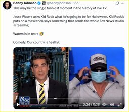 >>23767677 Jesse Waters asks Kid Rock what he’s going to be for Halloween. Kid Rock’s puts on a mask then says something that sends the whole Fox News studio screaming.