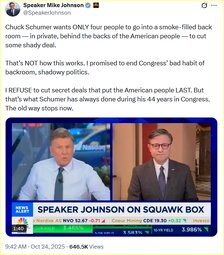 >>23767769 @SpeakerJohnson Chuck Schumer wants ONLY four people to go into a smoke-filled back room — in private, behind the backs of the American people — to cut some shady deal.