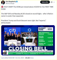 >>23765838 DOW closes above 47,000 for 1st time. Trump & Bessent were right. Apologize now "experts"