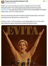 >>23767759 @SecScottBessent While she remains mostly focused on singing "Don't Cry for Me Massachusetts” and voting against paying government workers, @SenWarren