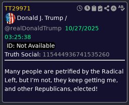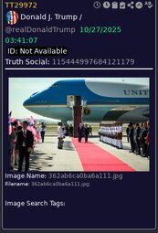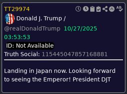 >>23774495, >>23774595 @realDonaldTrump Just leaving Malaysia, a great and very vibrant Country. Signed major Trade and Rare Earth Deals, and yesterday, most importantly, signed the Peace Treaty between Thailand and Cambodia. NO WAR! Millions of lives saved. Such an honor to have gotten this done. Now, off to Japan!!!