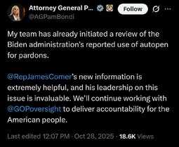 >>23781170 @AGPamBondi My team is reviewing the Biden administration’s reported use of autopen for pardons.