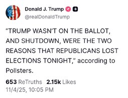 >>23813785 DJT: “TRUMP WASN’T ON THE BALLOT, AND SHUTDOWN, WERE THE TWO REASONS THAT REPUBLICANS LOST ELECTIONS TONIGHT,” according to Pollsters.