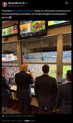 >>23833881 NOW - Trump attends the Washington Commanders "Salute to Service" game against Detroit Lions, making him the first sitting U.S. president since 1978 at a regular-season NFL game.
