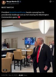 >>23833913 President @realDonaldTrump hands a young boy his presidential challenge coin as he’s leaving the Washington Commanders game ❤️