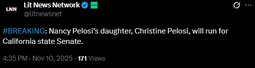 >>23836943, >>23836952 Christine Pelosi, Nancy Pelosi's daughter, will run for the California State Senate.