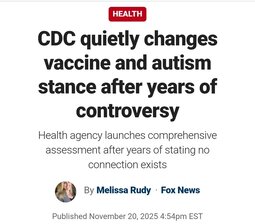 Fox News article from November 20, 2025, which reported that the CDC updated its website about the link between vaccines and autism. The update reportedly occurred after the U.S. Department of Health and Human Services (HHS) began a comprehensive assessment of potential causes of autism