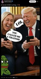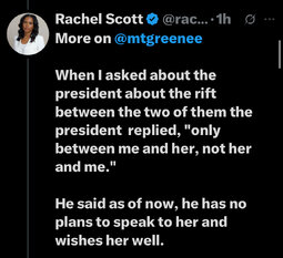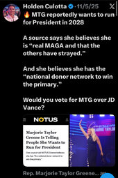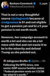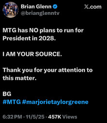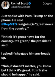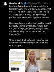 >>23885917, >>23885937, >>23885942, >>23885959, >>23885968, >>23886120, >>23886289, >>23886428 Another self serving Congressional member bites the dust, MTG my last day being January 5th, 2026."