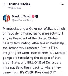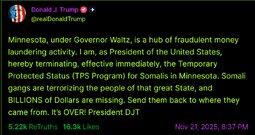 >>23886084 @realDonaldTrump Minnesota, under Governor Waltz, is a hub of fraudulent money laundering activity. I am, as President of the United States, hereby terminating, effective immediately, the Temporary Protected Status (TPS Program) for Somalis in Minnesota. Somali gangs are terrorizing the people of that great State, and BILLIONS of Dollars are missing. Send them back to where they came from. It’s OVER! President DJT