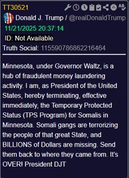 >>23886084 @realDonaldTrump Minnesota, under Governor Waltz, is a hub of fraudulent money laundering activity. I am, as President of the United States, hereby terminating, effective immediately, the Temporary Protected Status (TPS Program) for Somalis in Minnesota. Somali gangs are terrorizing the people of that great State, and BILLIONS of Dollars are missing. Send them back to where they came from. It’s OVER! President DJT